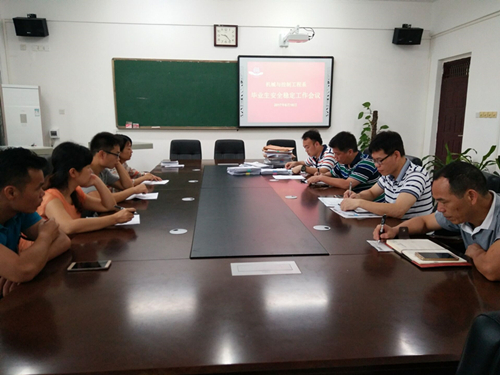 会上,我系副书记兼学工组长莫天荣先传达了分校2017年春季学期期末安全稳定工作会议精神,要求系部领导、毕业班实习指导老师和班主任密切关注、了解所有实习学生的情况,加强安全提示和教育,同时高度关注非毕业在校生的基本状态。