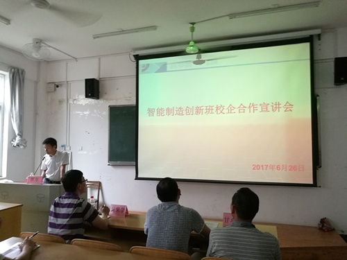 2017年6月26日下午4点50分,我系在2205多媒体教室召开首期“智能制造创新班”校企合作宣讲会,会议特别邀请了上海润品科技有限公司的贾方经理来给同学们进行宣讲,同时与会的还有分校校长助理刘高鹏、我系主任黄荣学、副主任甘卓权及智能制造生产线相关负责人。此次宣讲会吸引了我系许多有意参加创新班的同学,大家齐聚这里了解创新班的相关培训内容及报名要求。