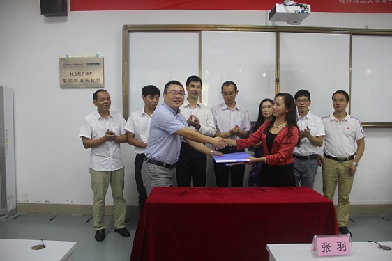 紧接着,指导教师代表和学生代表分别进行了发言。随后,双方领导为实验班揭牌,为实验班14位同学佩戴学员证,张羽副总为实验班颁发奖学金,双方签订校企合作协议。最后,双方一起参观实训室,并进行进一步的合作洽谈。
