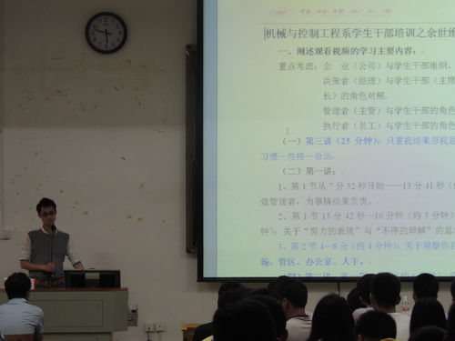 3月16日到3月23日,我系开展为期一周的学生干部培训班,对我系240多名学生干部进行集中培训学习。本次培训班主要从培养学生干部的责任感以及提高其理论水平、工作能力、综合素质入手,通过专题讲座、理论学习、座谈交流等多种形式,讲述公文写作的方法、弘扬正能量做快乐学生干部的途径以及学生干部在校园安全如何发挥自己的作用。