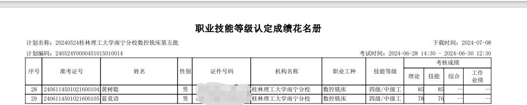 机械与控制工程学院于2024年6月28日-6月30日开展了2024年第五批次职业技能等级认定考试。本批次认定考试数控铣工29人共29人。现将考试成绩公布如图,公示时间7月1日至7月5日。