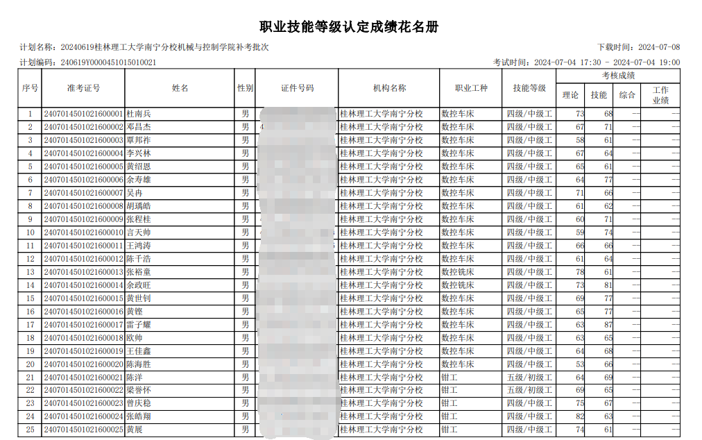 机械与控制工程学院于2024年7月4日开展了2024年职业技能等级认定补考考试。本批次认定考试共25人。现将考试成绩公布如图,公示时间7月5日至7月11日。