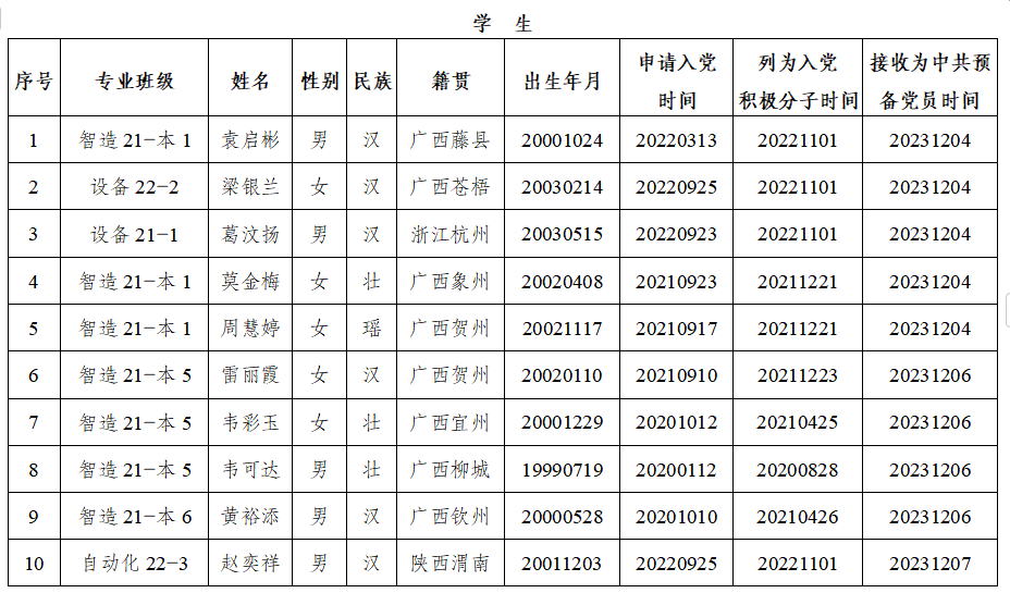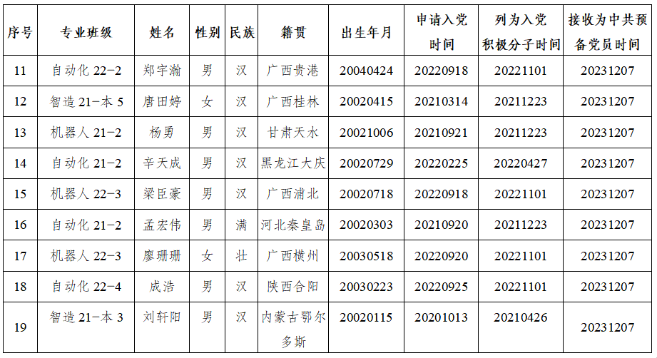经党组织一年以上的培养教育,袁启彬等19名预备党员预备期满(其中机械与控制工程学院学生19人),机械与控制工程学院党支部拟在近期召开党员大会讨论他们的转正问题。为了进一步增强发展党员工作的透明度,严格发展党员工作程序,根据《中国共产党发展党员工作细则(试行)》和自治区党委组织部关于印发《关于在发展党员工作中实现入党前公示的暂行规定》的通知(桂组通字〔2000〕91号)文件的有关精神,现将近期拟讨论转正问题的预备党员名单公示如下,公示期为5个工作日,自2024年11月28日至2024年12月04日止。对以下19名同志的转正问题,如有异议,请以书面形式并署真实姓名,于2024年12月04日前向机械与控制工程学院委员会反映。
