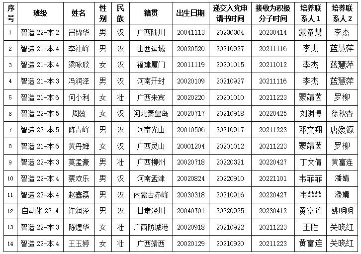 经各党支部培养教育和考察,以上14位同志已基本具备党员条件,在征求培养联系人、党员和群众意见的基础上,经各支部委员会讨论同意列为发展对象人选。
