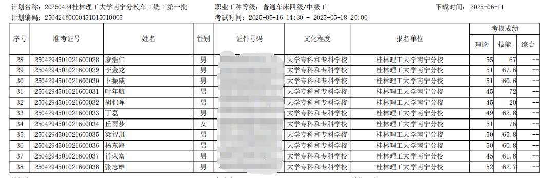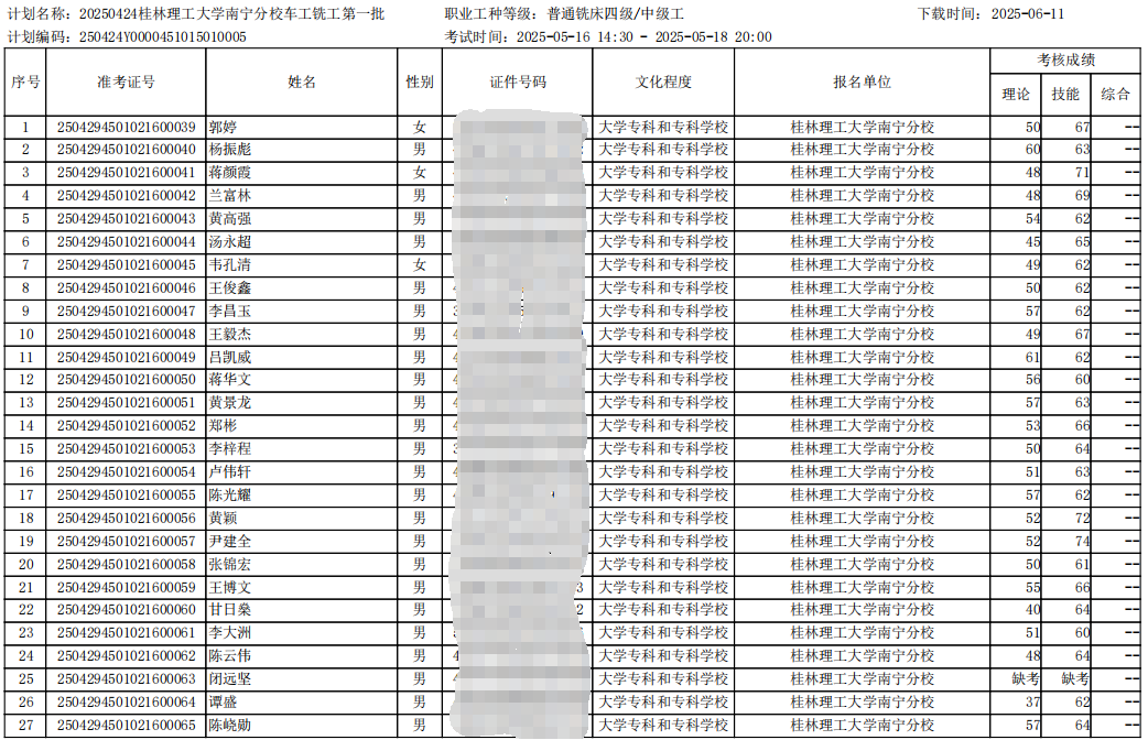 我学院于2025年5月16日-5月18日开展了2025年第一批次车工铣工中级职业技能等级认定考试。本批次认定考试铣工中级36人,车工中级38人。现将考试成绩公布如图,公示时间5月20至5月28日。
