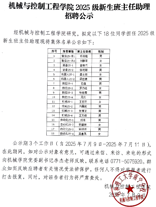 机械与控制工程学院2025级新生班主任助理招聘公示
