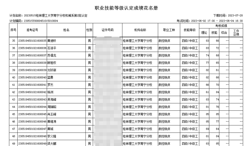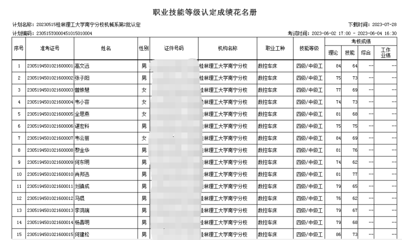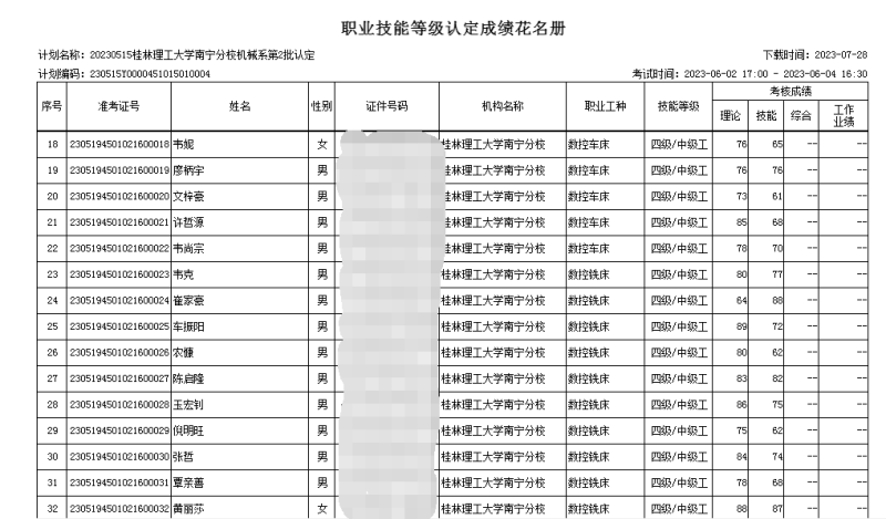 我系于2023年6月2日-6月4日开展了2023年第二批次职业技能等级认定考试。本批次认定考试数控铣工29人,数控车工22人共51人,合格率100%。现将考试成绩公布如图,公示时间6月12至6月17日。