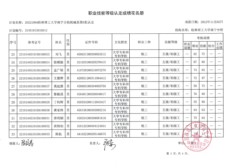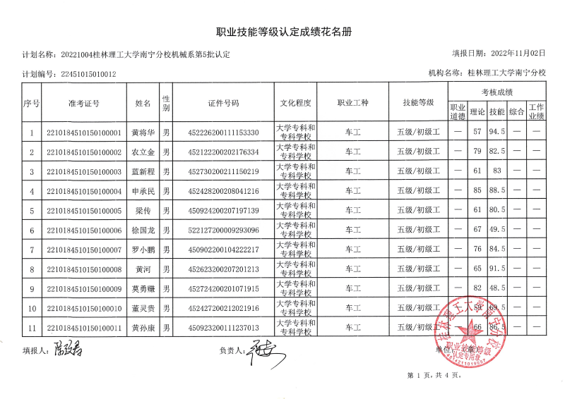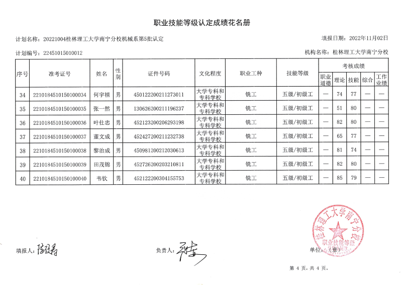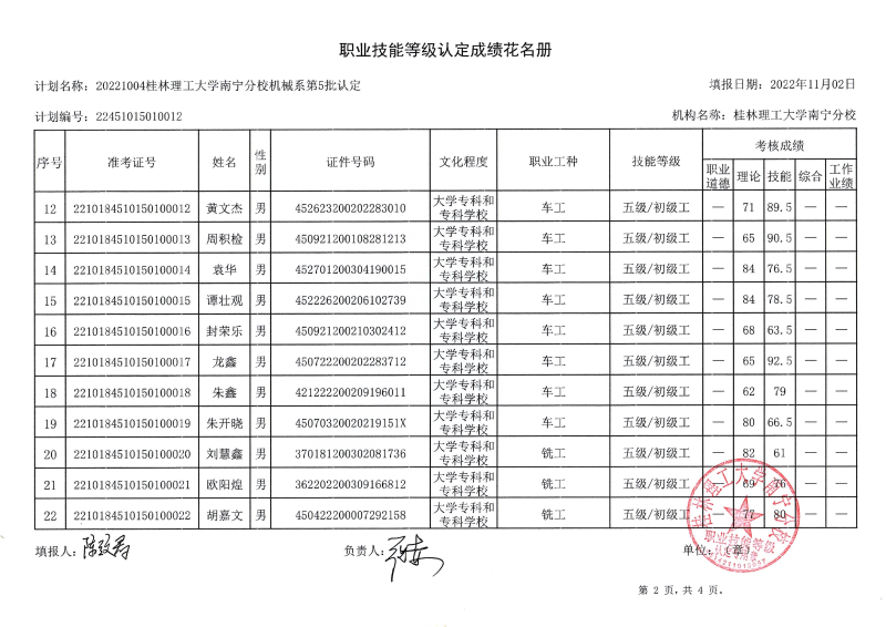 我系于2022年10月25日开展了2022年第五批次职业技能等级认定考试。本批次认定考试车工19人,铣工21人共40人,全部合格。现将考试成绩公布如图,公示时间从11月2至11月12日。