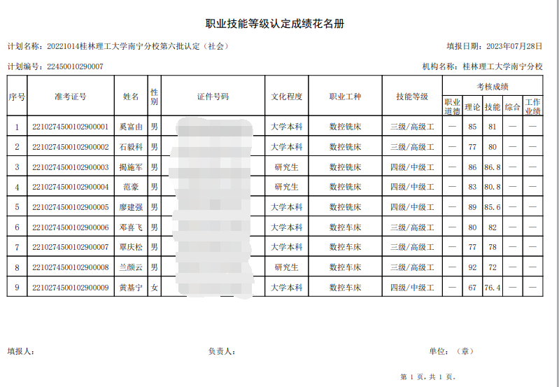 我系于2022年10月27日开展了2022年第6批次职业技能等级认定考试(教职工)。本批次认定考试数控铣工5人,数控车工4人共9人,合格率100%。现将考试成绩公布如图,公示时间11月3至11月8日。