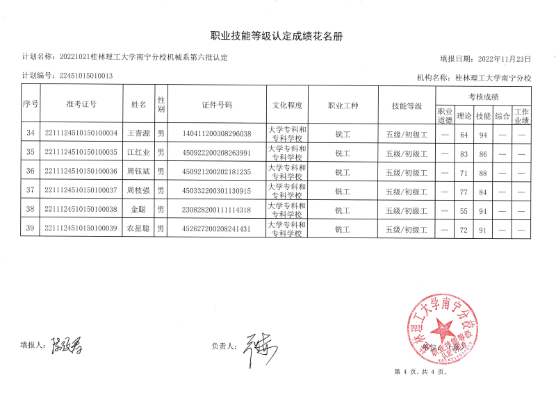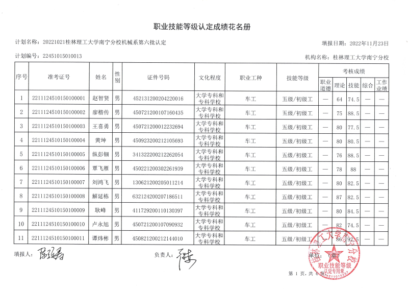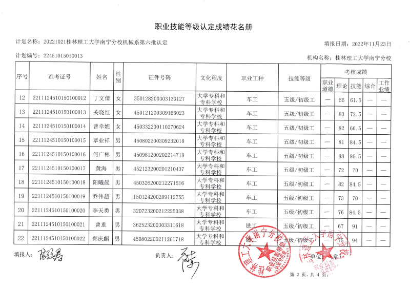 我系于2022年11月12日开展了2022年第六批次职业技能等级认定考试。本批次认定考试车工20人,铣工19人共39人,合格率87.18%。现将考试成绩公布如图,公示时间从11月24至11月30日。