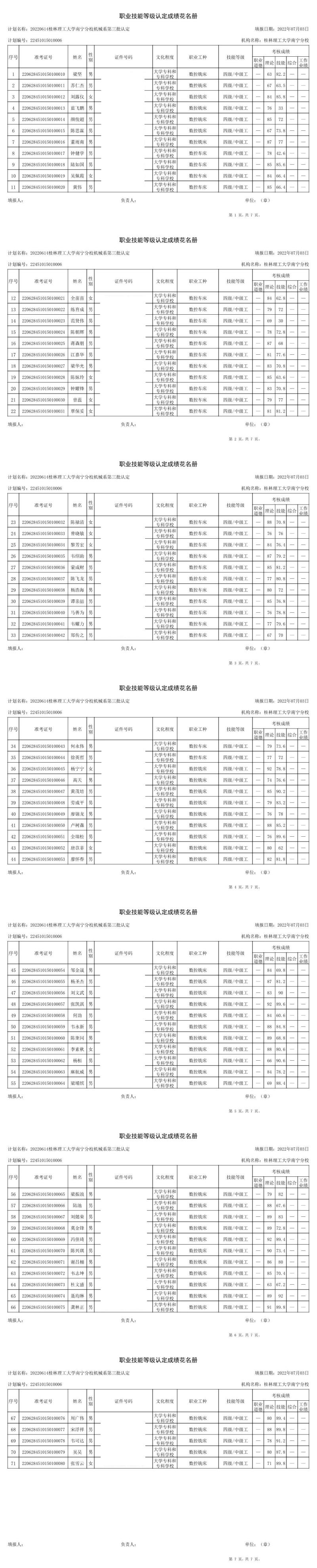 我系于2022年6月28日至30日开展了2022年第三批次职业技能等级认定考试。本批次认定考试数控车工32人,数控铣工48人,共80人,其中数控车工合格30人,数控铣工合格47人。现将考试成绩公布如图,公示时间从7月3日至7月7日。