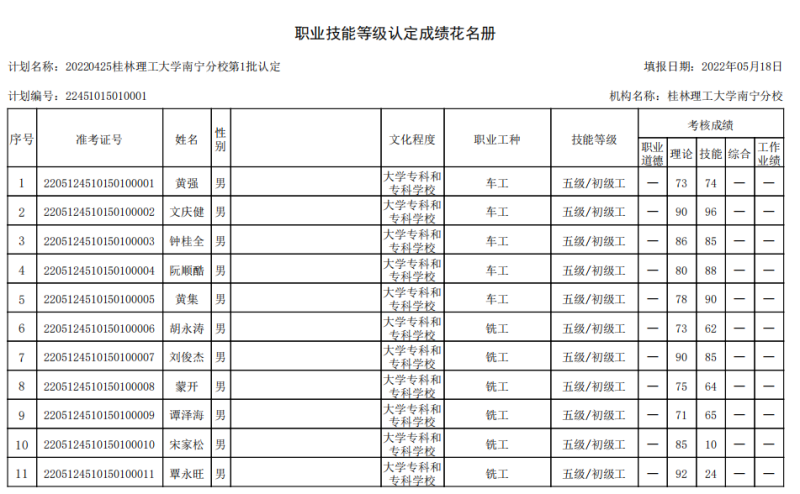 我系于2022年5月12日开展了2022年第一批次职业技能等级认定考试。本批次认定考试车工5人,铣工6人,共11人,其中车工全部合格,铣工2人不合格,。现将考试成绩公布如图,公示时间从5月18日至5月22日。