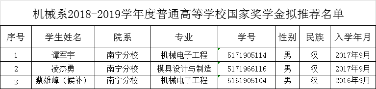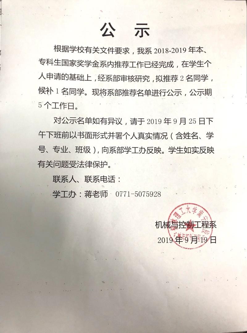机械与控制工程系关于2018-2019学年度国家奖学金拟推荐学生名单公示
