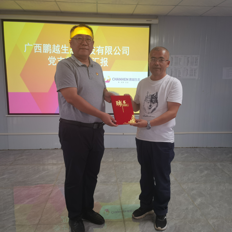 最后,为推动校企深度交流合作和我校内涵式发展,我系引进广西鹏越生态科技有限公司高级工程师贺加兵作为客座教授,并在此次党日活动现场为其颁发了聘书。