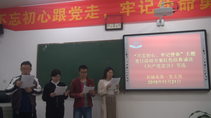 为继承和发扬党的光荣传统、坚定理想信念,2019年11月21日下午,机械第一党支部在系办3205举办了“不忘初心、牢记使命”主题教育。 本次培训活动以《红色系列主题》分享的形式进行,共计11名教师党员参加。本次活动继承和发扬了党的光荣传统,帮助激励党员树立崇高理想,丰富了党员同志的学习生活。