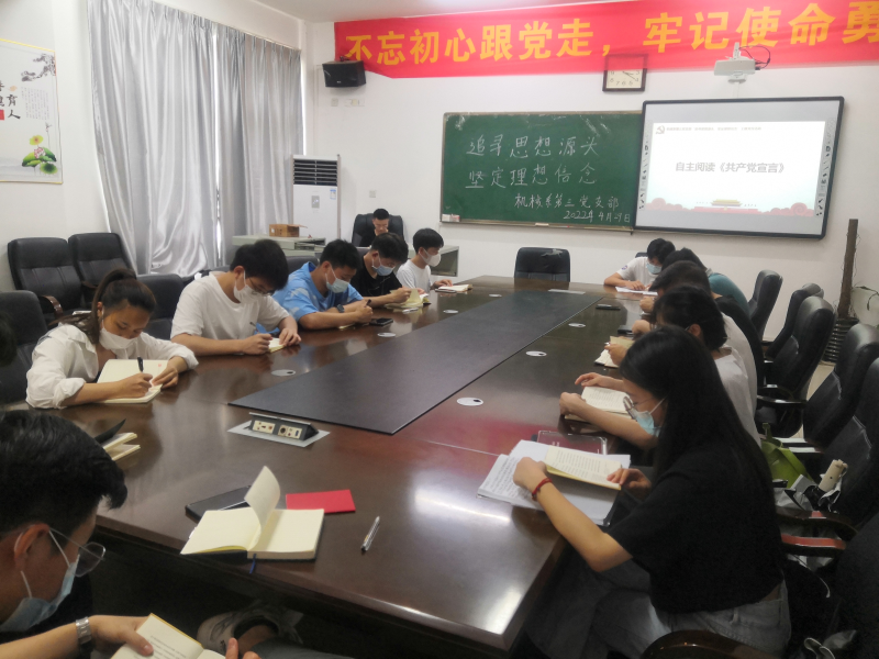 会前,全体党员齐唱国歌。在庄严肃穆的国歌过后,支部副书记丁敬煜领学《新时代的中国青年》白皮书。然后,全体党员自主阅读《共产党宣言》,在阅毕后,在场党员轮流发表学习心得以及分享《共产党宣言》相关故事:丁敬煜同志为大家分享了陈望道先生翻译《共产党宣言》的党史故事;教师党员唐庆同志为在场学生党员寄语,马克思在他的时代乃至为后世做出了巨大贡献,一个时代的人干一个时代的事,新时代的中国青年要奉献到中国特色社会主义新征程去;学生党员刘永飞同志表示,我们要不断从马克思主义经典著作中汲取力量。讨论完毕,全体党员又学习了世界共产主义运动史和齐唱国际歌。