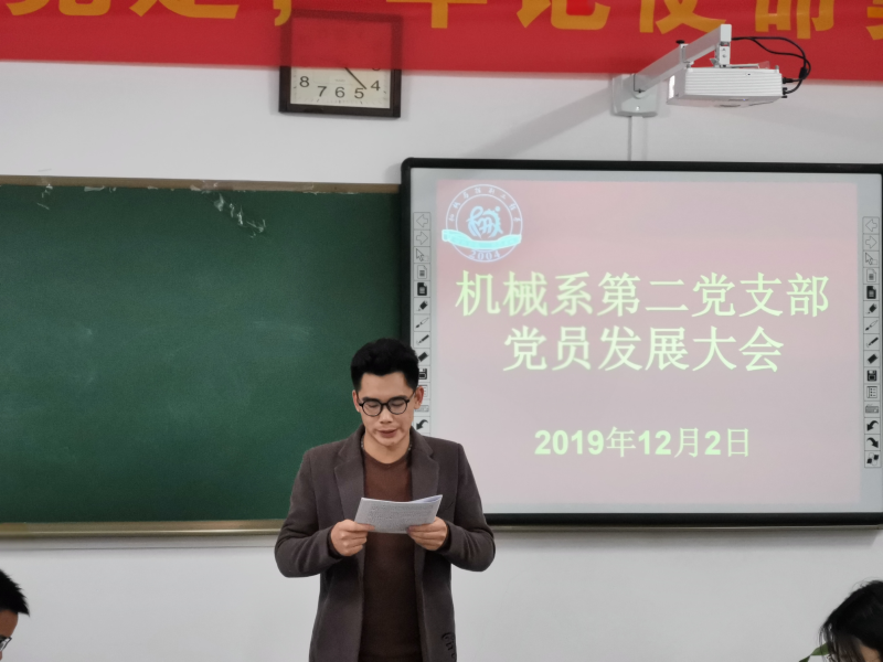 大会开始,发展对象逐一宣读自己的入党志愿书,由各位正式党员对其进行提问评价及投票表决,最终由支部书记李杰同志宣布支部决议。李杰书记代表代支部向新当选的预备党员表示衷心的祝贺,并向新同志们提出了以下三点要求:一是强化学习意识,不断加强党的理论知识学习;二是端正党的动机,主动接受党的教育考验;三是发挥模范作用,以实际行动争取早日入党。