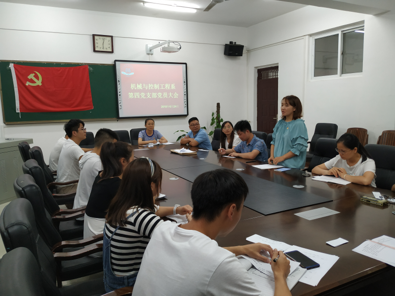 2019年6月24日下午17:40,机械系第四党支部在藏修楼 3205会议室召开了预备党员转正大会,本次会议由第四党支部书记李肖然同志主持,支部全体在校党员、转正党员及其入党介绍人参加会议。
