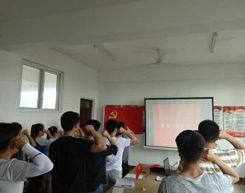 会议初,先由预备党员宣读入党志愿书,念自己的一些身份信息和与本人相关的社会关系信息,由其入党介绍人表述预备党员的一些近期的发展情况和思想情况,再由正式党员进行投票是否同意其申请入党志愿书,是否成为正式党员。然后,全体成员起立举手并一同重温入党誓词、共同学习新的党章。