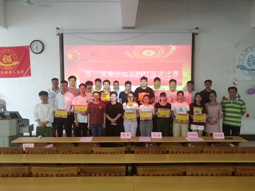 为进一步加强廉洁精神,推进廉洁文化进校园,营造学校廉洁的良好氛围。我系为6月21号下午在8201举行“第三届廉洁知识PPT演讲比赛”,本次比赛由我系党总支书记袁斌老师、辅导员何建金、李肖然、韦选建老师、我系吴波老师担任评委,参与本次比赛的还有各班代表、我系学生会成员及各参赛队伍。