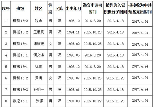 经党组织一年以上的培养教育和考察,程希等8位同志被列为党员发展对象,机械与控制工程系第二党支部拟在近期召开党支部大会讨论他们的入党问题。为了进一步增强发展党员工作的透明度,确保发展新党员的质量,根据《中国共产党发展党员工作细则(试行)》和自治区党委组织部关于印发《关于在发展党员工作中实现入党前公示的暂行规定》的通知(桂组通字[2000]91号)文件的有关精神,现将发展对象名单公示如下,公示期7天,自2017年04月25日至2017年05月01日止。对他们的入党问题,如有异议,请以书面形式并署真实姓名,于2017年05月01日前向机械与控制工程系总支部委员反映。