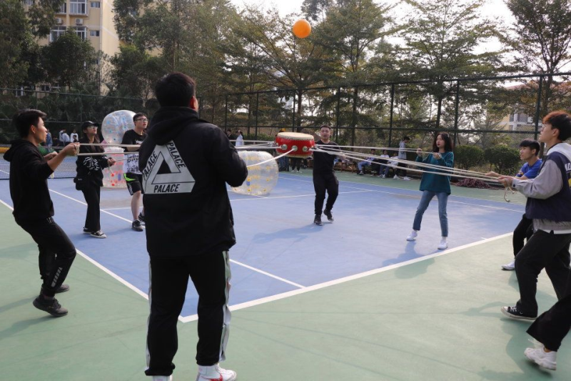 此次活动的项目有:搭桥过河、有轨电车、击鼓传球、旱地龙舟、碰碰球、拔河比赛。在比赛过程中,大家都积极地参与活动,每个的脸上都洋溢着开心的笑脸。