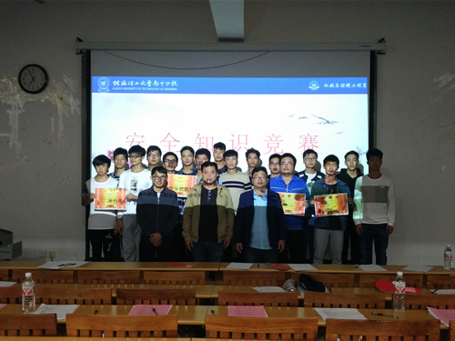 为提高学生安全防范意识,响应安全活动月的号召。经过一轮的预赛后,我系于11月15号在启智楼201教室举行“知识竞赛”决赛。出席本次决赛的有我系党党总支记袁斌老师、我系辅导员张业娟老师、李肖然老师、何建金老师、陈平东老师、韦选建老师;我系全体学生会成员、参赛队伍及17级各班代表。