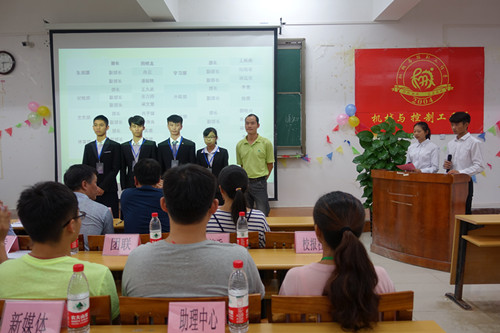 换届大会以一段激励奋进自制录制的视频为开头,视频中学生会14、15级干事志气满满的宣读出了自己部门的宣言,表达了对新加入学生会的16级试用干事的欢迎;然后莫天荣老师发言:希望学生会干部可以加强理论学习,作为好的风气的倡导者和宣传者;同时希望学生会干部学会服务,以服务同学为宗旨,努力提高学生会干部素质。而后第五届团总支学生会学生干部代表梁廷钦发言,对之前照顾并支持着我们的老师同学们表示了感谢,也对下一届学生会委员们提出了自己的理想,希望我们能比他们做的更好,带领学生会走向更辉煌的明天;接着进行的是第五届学生会聘书颁发仪式,谢晓明老师和张斯亮老师为第五届学生干部颁发聘书后,张斯亮老师宣读了第六届团总支学生会委员名单,莫天荣老师和罗勇老师为第六届团总支学生会委员进行了挂牌。