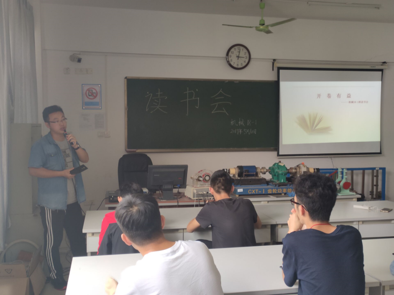 2019年5月10日我系机械18-1班在藏修楼3304举行班级特色活动“开卷有益”机械18-1班读书会,机械18-1班全体同学参加此次活动,活动由学习委员张凯同学主持,特邀班主任范豪老师参加活动。