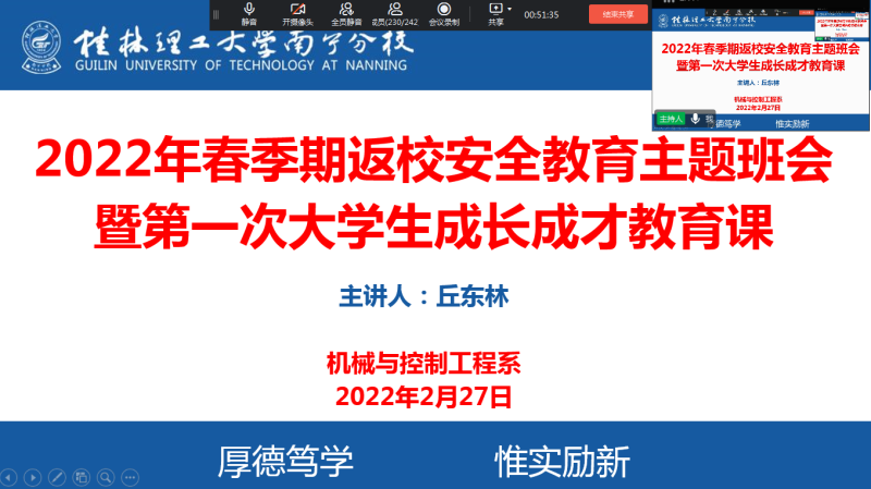 2022年2月27日晚上8:00,我系智造专业19、21级召开召开线上春季期返校安全教育主题班会暨第一次大学生成长成才教育课,我系智造专业19、21级班级全体学生参加活动。此次会议由辅导员丘东林老师主持。