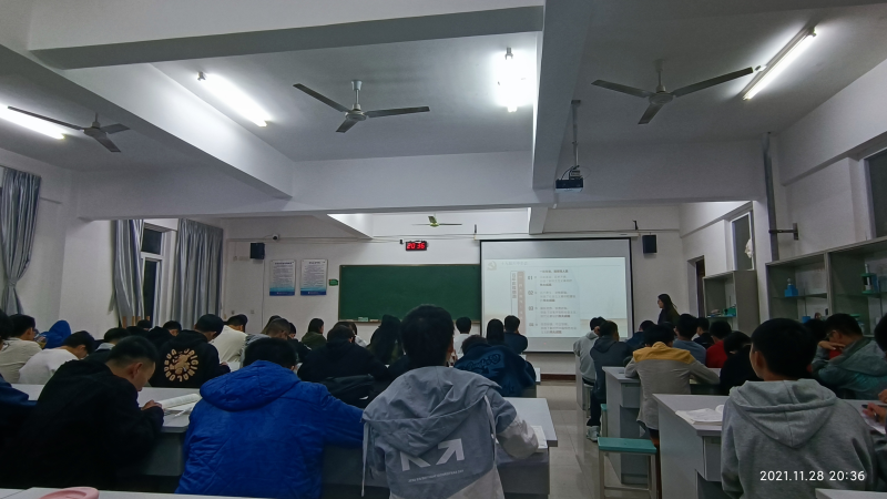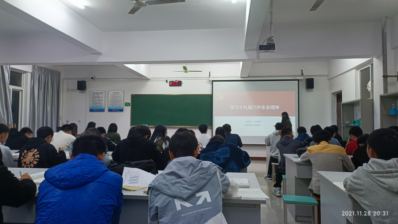 为了让同学们能够跟上政治思潮,学习十九届六中全会精神,我系智造21-本1、2班开展学习十九届六中全会精神主题课程。本次课程于2021年11月28日星期天晚上在藏修楼3402展开,由辅导员丘东林老师主持,智造21-本1、2班全体同学参与到课堂之中。