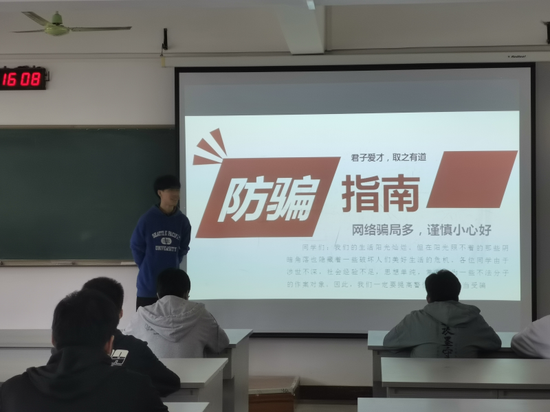 在现如今的社会,诈骗案件越来越多,手段也越来越高明,至开学以来我校发生了多起学生被骗事件。犯罪分子利用一些学生的虚荣心贪便宜、单纯等心理特点实施各种诈骗伎俩,使部分学生蒙受巨大的财产损失和精神压力。为增强大家防骗意识提高自我防范能力,警惕电信诈骗。我系智造20-本2班于11月2日下午四点,在藏修楼3402教室,开展“防电信诈骗安全教育”主题班会,班级全体成员参加。本次班会由班长廖人祥主持,同时出席的还有班主任韦宁照老师。