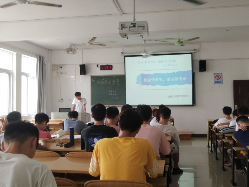 为增强同学们诚信考试的意识,6月9日11点50分,机电18-本1班、2班于2306教室共同开展“诚信考试教育”主题班会,会议以PPT的形式进行,由梁奇翔同学主持。