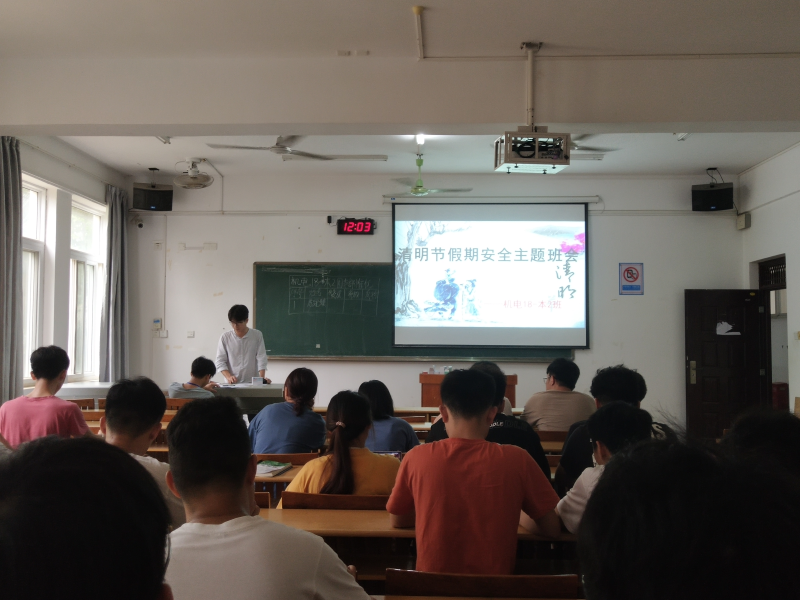 清明节,一个缅怀先人、祭祀祖先的节日。根据系部指示,机电18-本2班于3月30日12点在6203教室开展了清明节假期安全主题班会,会议以PPT的形式展开,由粟天星同学主持,班会的主要人员有:班主任黄基宁老师。