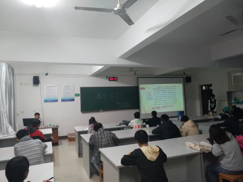 在班级各班委的组织下,班级管理的井然有序。此次班会旨在提倡同学们树立诚信的良好品质,在生活中坚持“诚信为本”,养成诚信的好习惯,特别是在四六级考试和期末考试中,诚信考试尤为重要。