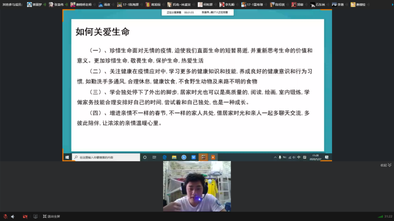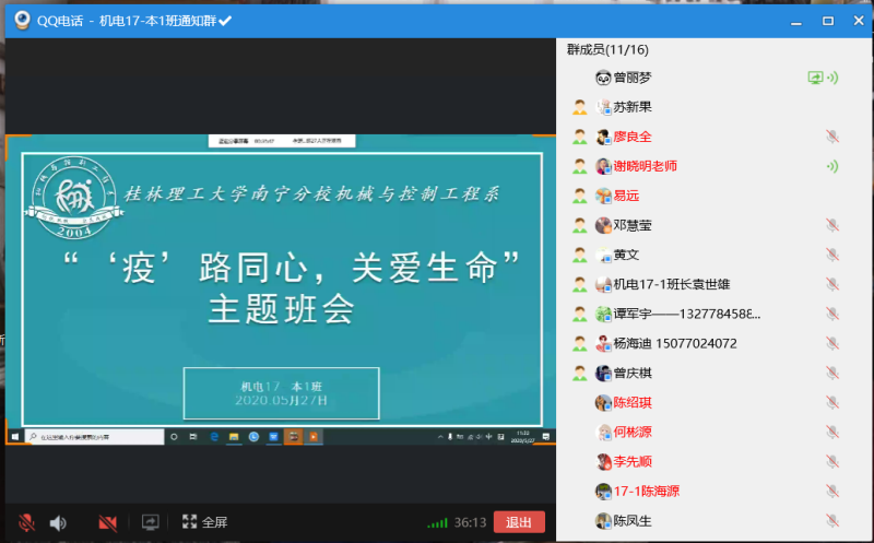 5月27日上午11时,根据学校要求,机电17-本1班于线上召开“疫路同心,关爱生命”主题的宣传教育班会。班会由心理委员曾丽梦同学主持,班主任谢晓明老师及机电17-本1班全体成员参加。