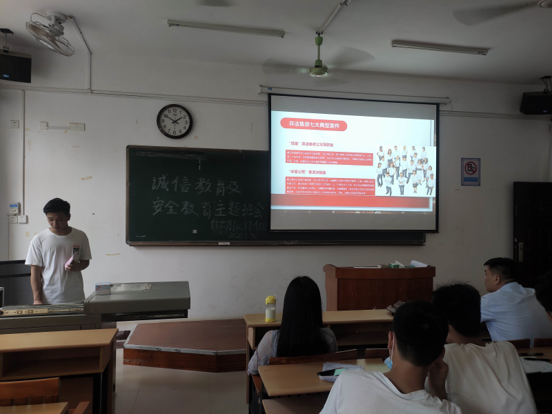班会伊始,由班长屈铭宣布班会开始。这学期因为疫情原因,同学们在家学习了一个多月,班级新来一位同学,开始班会便由新同学给大家做自我介绍,同时谈论个人感受,新同学对自己生病时得到了班级同学们的关心及帮助表示感谢,同时对近两个月的愉快相处表示高兴。新同学发言之后便由班长开始诚信考试及暑假离校安全教育环节。会上,强调了诚信考试的重要性,会上不仅从法律和校规上对考试作弊的行为进行否定,还举了一些考试作弊学生因作弊而产生不好后果的例子。诚信考试内容结束之后,会上还集中讲了对于非法集资及其表现形式,从法律层面上讲了参与非法集资的风险。非法集资手段简述为以下几点:一承诺高额回报、二编造虚假项目,同时会上还讲解了相关的案例分析。对于其相应的应对方法主要又可概括为“看”和“等一夜”。之后,会议的重点便是暑假离校,会议上要求离校时一要打扫宿舍卫生,二要锁好门窗、关好水电,三离校注意安全等各项安全事项。班长屈铭发言结束后,由辅导员何建金老师进行发言,何老师对诚信考试、暑假工作兼职、交通安全、网络安全、溺水教育、返校、疫情防控(提醒同学们注意及时钉钉打卡)等问题进行安全教育。