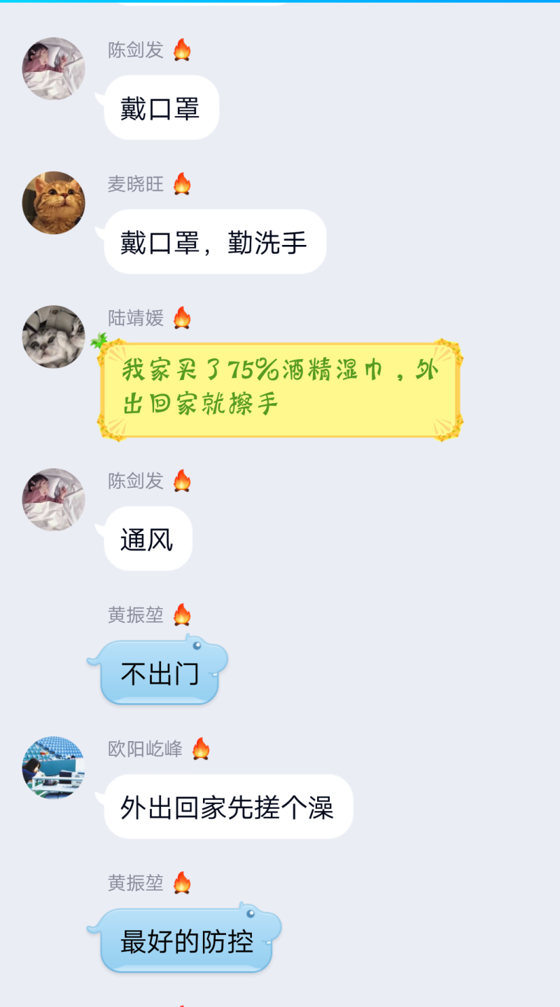 关于这次疫情,团支书王世泳同学首先向同学们介绍了病毒的基本情况,而后询问同学们对疫情的了解程度,同学们都积极反应,表示每天都有关注相关信息,有大部分同学表示自己防疫知识丰富。紧接着是知识竞答环节,此环节中,同学们反应热烈,争相抢答,公布答案后,有疑问的同学提问,懂得同学进行科普,还有同学分享了自己防疫的措施,班里氛围融洽,一团和气。最后王世泳同学表示同学们的意识形态工作做的很到位,防护意识强,同时也提醒同学们,注意保护自身和他人的健康、生命安全。