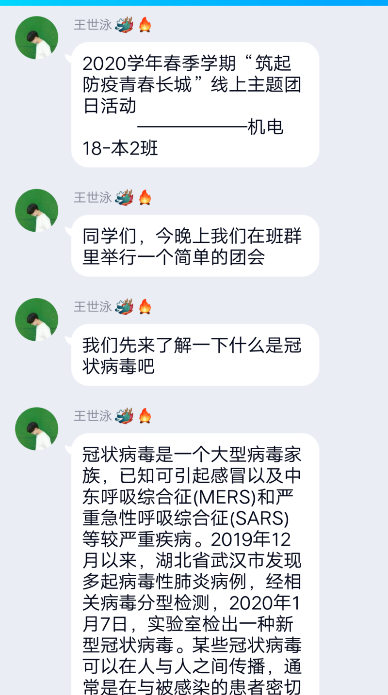 为了解与促进同学们对新型冠状病毒的认识,2月20日晚上9时,机电18-本2班进行了“筑起防疫青春长城”线上主题团日活动。本次活动主要以知识小竞赛的形式展开。