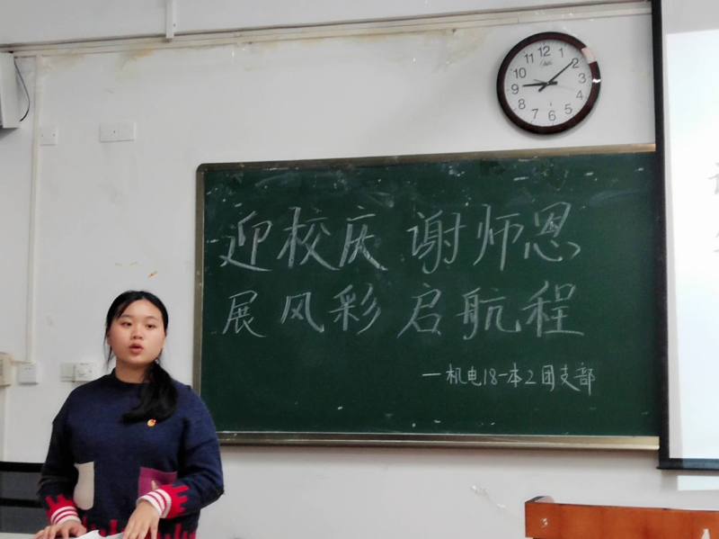2019年是太阳集团2138建校63周年,为迎校庆,12月4日21时,机电18-本2班于6304教室开展“迎校庆谢恩师,展风采启航程”主题团课活动,本次团课特邀嘉宾:班主任黄基宁老师、团委·学生部副主任粟天星同学、机械系团总支副书记叶香艳同学、分校学生会常务副主席陆靖媛同学参加了此次活动。