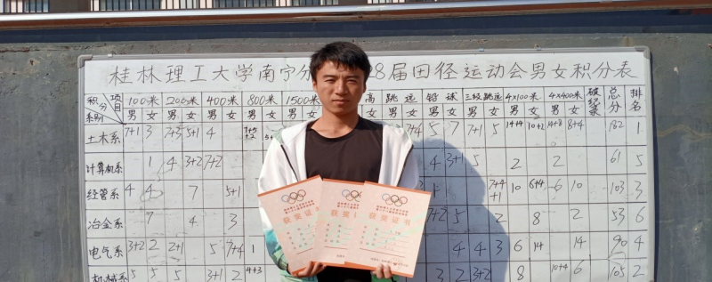 最终,机电19-本2班的运动员莫立高同学取得了男子组的100米和200米第二名,4×100米的好成绩,为他自己和班级赢得了荣誉,也为他的大学生活画上了浓重的一笔。