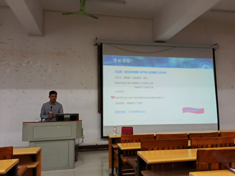 我系18届校友甘昆武向同学们分享了自己的求职经历和工作经历,自己两年来的所见、所闻、所感,以及在工作岗位上的成长和收获。最后进行现场互动环节,甘昆武校友对于同学们提出的疑问,一一进行解答,并祝愿祝愿同学们都能找到自己心仪的工作岗位。