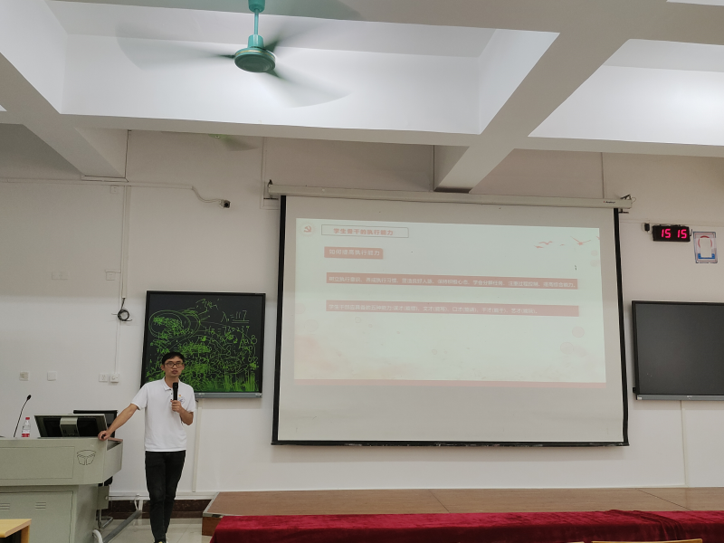 培训中,韦选建老师首先从学生骨干的职责、应当具备的素质以及如何提高能力三个方面对学员做出指导,他强调“学生骨干要做好系部与同学之间的桥梁纽带作用,及时传达和落实系部和学校的工作安排,要发挥主观能动性,积极思考、扎实工作,确保同学们的需求及时得到反馈”。同时,韦选建老师还以学生工作的实际例子作为典型案例,在培训会上进行分析和总结,让全体学员对如何提升执行能力和综合素养更加通俗易懂。