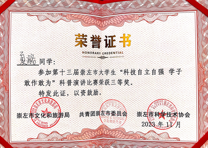 我系学子参加“科技自立自强 学子敢作敢当”2023年崇左市大学生科普演讲比赛荣获佳绩