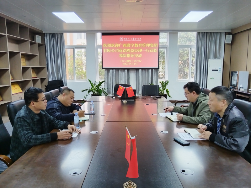 3月13日上午,在物华楼6406会议室,广西联宇教育管理集团有限公司蒋铠骋总经理一行莅临我院交流。学院负责人刘茂军、许国平出席会议。