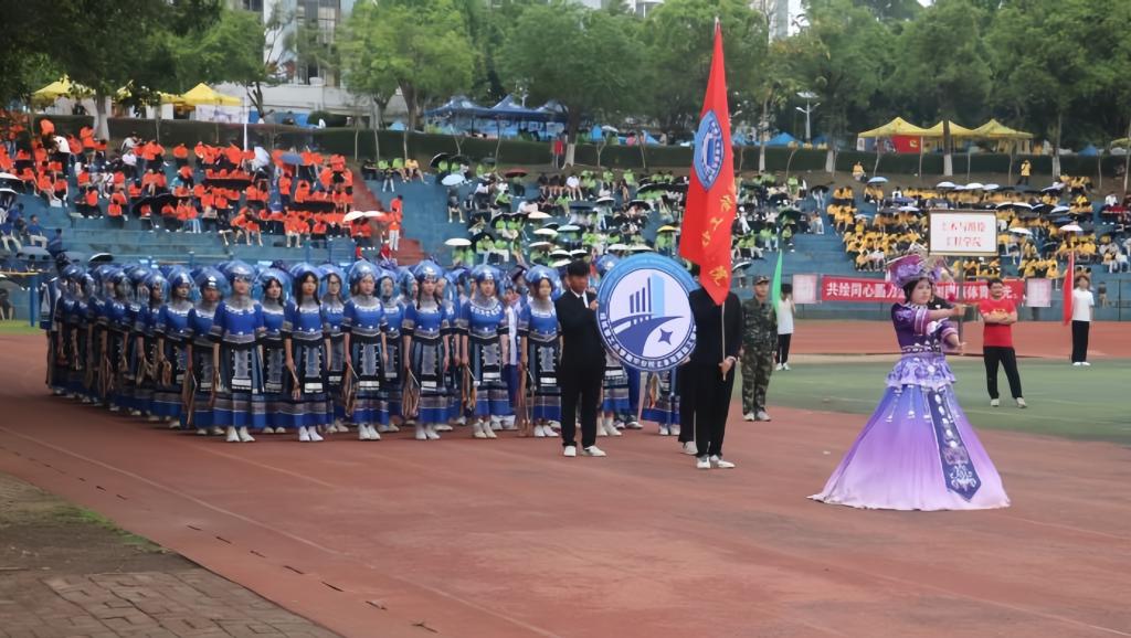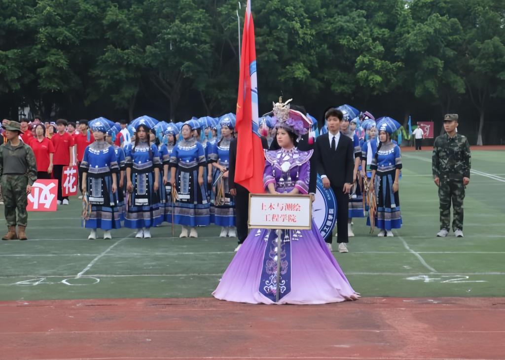 伴随着铿锵有力的运动员进行曲,土木与测绘工程学院方块队昂首阔步地走来,他们身着精美绝伦的民族传统服饰,精神抖擞,步伐稳健,尽显独特的民族气质,为观众呈现一场视觉盛宴。他们的表演充分展现了土木学子的活力,嘹亮的口号震撼着在场每一个人,充分彰显着学院学子的青春朝气与文化自信,展现了新时代大学生的青春活力和积极向上的精神风貌。土木与测绘工程学院方块队的精彩表演不仅是一场体育盛会的开篇,更是一次民族文化交融、团结奋进精神弘扬的生动展示。