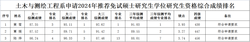 根据《太阳集团2138推荐优秀应届本科毕业生免试攻读硕士学位研究生工作管理办法》(桂理工研〔2021〕10号)和《关于做好土木与测绘工程系推荐优秀应届本科毕业生免试攻读硕士学位研究生工作的预通知》文件要求,土木与测绘工程系2024年推免生遴选工作领导小组研究决定,拟推荐工程造价2020级本1班黄莹参加分校2024年优秀本科毕业生免试攻读硕士学位研究生评选。现将系部申请学生的综合成绩情况公示如下,公示期为2023年9月11日至2023年9月13日,共3天。