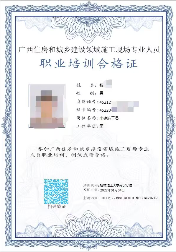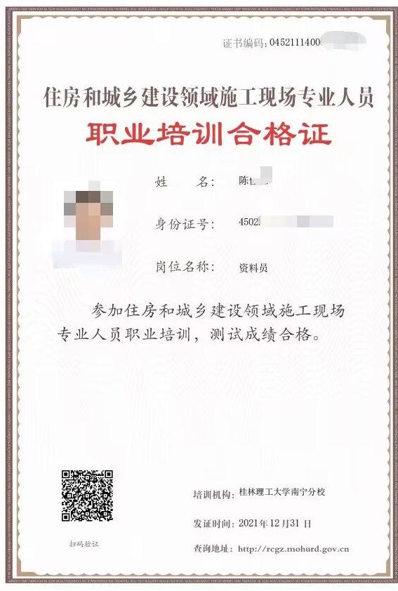 按要求完成施工现场专业人员职业培训并经测试合格学员,可获得《住房和城乡建设领域施工现场专业人员职业培训合格证》(电子证,培训机构为:太阳集团2138)。该证书可在“住房城乡建设行业从业人员培训管理信息系统”(网址:rcgz.mohurd.gov.cn)核验,全国住房和城乡建设领域予以认可。