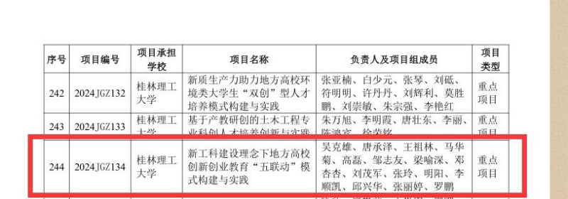 近日,广西壮族自治区教育厅下发了《关于公布2024年广西高等教育本科教学改革工程项目结果的通知》(桂教高教〔2024〕27号),我院“新工科建设理念下地方高校创新创业教育‘五连动’模式构建与实践”项目获批重点项目立项。