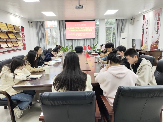 为了推动理论学习常态化,提高支部党员的理论修养,我院学生第四党支部于 2024 年1月11日下午在6406会议室开展“学习贯彻习近平总书记在中共中央政治局常务委员会上的重要讲话精神”专题理论学习,本次专题理论学习由支部书记赖丽莉同志主持,支部组织委员张佳唯同志主讲。